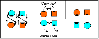 normalen Position (Herr links, Dame rechts), tanzen sie courtesy turn (es wäre nichts anderes als ein right and left thru). Steht ein Paar aber seitenverkehrt d.h. half