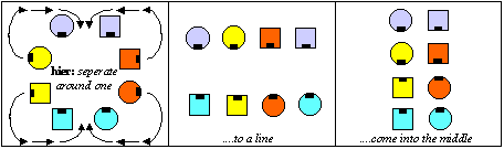 call: heads right and left thru & half sashay, pass thru – separate around "one" to a line of four (unterbrechen zum erklären)teach: line of four – wir nennen diese Formation so, weil wir zwei 'Linien' zu je vier Personen bilden. Dabei fassen sich alle Tänzer an den Händen.continue call: everybody go forward and back, join hands and circle left, everybody face your partner – pass thru, swing (ex-partner) and promenade home