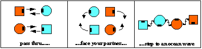 Empfohlene Lehrmethode für Sight Caller: Bringen Sie die Tänzer zu einer line of four Formation. Erst 'normal' in BGBG Anordnung, etwas später in sashayed Reihenfolge GBGB und wenn Sie es sich zutrauen, auch in mixed Positionen BBGG. Nun callen Sie die Figur pass the ocean, ohne diese aber zu nennen, sondern sie callen directional: pass thru - face your partner - step (make) to a (right hand) ocean wave. Danach lösen Sie die ocean wave Formation mit swing thru - boys (girls - centers) run right - bend the line wieder zu einer line of four auf. Sie können diese Sequenz nun wiederholen, oder die Reihenfolge mit right and left thru oder half sashay, wie es Ihnen beliebt, ändern. Auch wenn sie swing thru weglassen, ändern Sie damit das Geschlecht von boys zu girls. Sie bleiben aber vorerst in ihrer Vierergruppe zusammen, und das ist gut so. Callen Sie diese o.a. Sequenz mehrere Male (empfohlen: mindestens zehn Mal) und geben Sie dabei den Tänzern Zeit, sich zu orientieren "wo" ihr Partner steht. Weisen Sie darauf hin, immer zu einer right hand ocean wave vorzutreten. Erst jetzt sagen Sie den Tänzern, dass Sie die so oft getanzte Sequenz pass thru - face your partner - step (make) to a (right hand) ocean wave umbenennen und einen Namen geben: pass the ocean. Weisen Sie die Tänzer dabei an, diese Regel auswendig zu lernen und ggf. beim Tanzen vor sich herzusagen. Es ist ratsam, die Figur anfangs noch weiter mit der directional Anweisung zusätzlich zu unterstützen, bis es reibungslos klappt. |