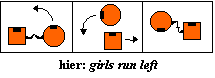 run - from facing the same direction Zurück zur Definition: Der angesprochene ‘aktive’ Tänzer (boys, girls, centers, ends, etc.) geht in einem Halbkreis (180°) vorwärts um den neben ihm stehenden ‘inaktiven’ Tänzer, der eine beliebige Blickrichtung haben kann, herum bis zu dessen Ausgangsposition. Der inaktive Tänzer weicht aus, indem er, ohne sich umzudrehen, auf den frei gewordenen Platz des aktiven Tänzers geht. Es ist also wichtig, dass der aktive Tänzer vorwärts geht, d.h. vor dem inaktiven Tänzer auf dessen Platz wechselt. |